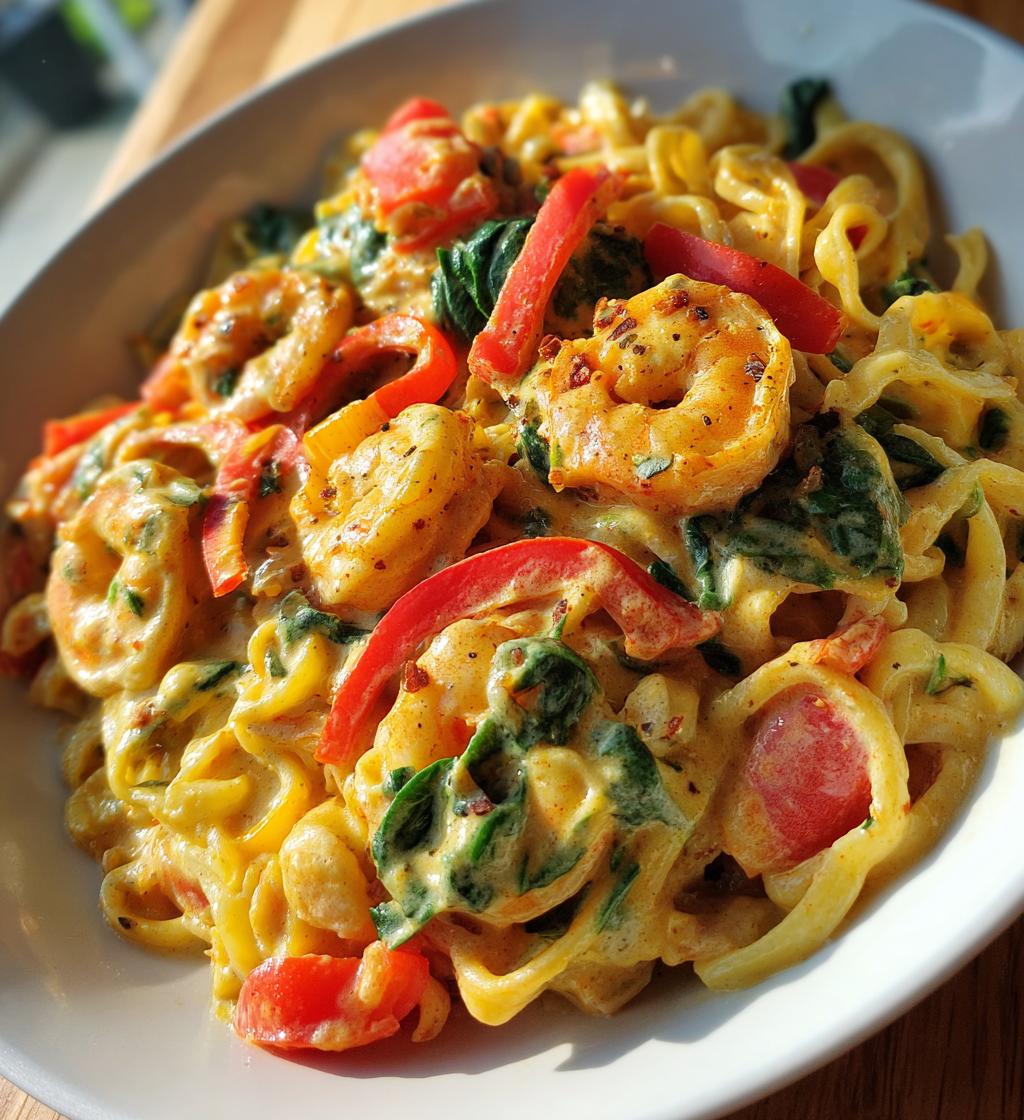 A delicious and creamy Jamaican shrimp rasta pasta dish that combines flavorful spices with succulent shrimp and colorful vegetables.