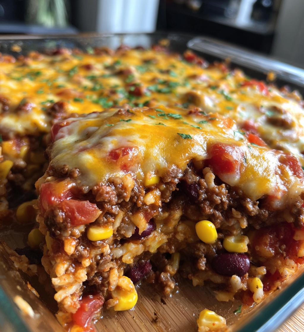 Once your meat is beautifully browned, it’s time to mix it all up! Lower the heat a bit and add in the can of diced tomatoes (juice and all), kidney beans, corn, and the cooked rice. Sprinkle in those spices—2 teaspoons of chili powder, 1 teaspoon of cumin, and a pinch of salt and pepper to taste. Stir everything together until it’s well combined. You want all those flavors to mingle and dance together!